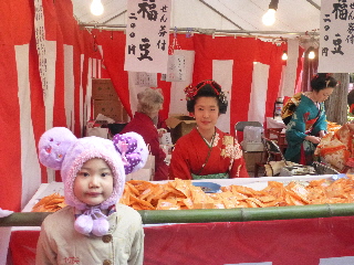 気を取り直して「福豆」売りのお姉さんとツーショット![]()